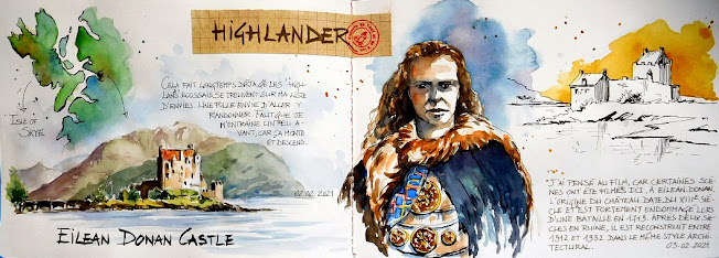 Fortement inspirée par ma lecture du jour sur l'Ecosse (dans le magazine Bouts du Monde), j'ai fait une double page le soir sur le thème d'Eilean Donan et Highlander. Eh oui, en ce moment, on cherche l'inspiration là où on peut... Mais c'est sympa, c'est le moment de se documenter un peu, et de cette façon, on voyage un tout petit peu quand-même....